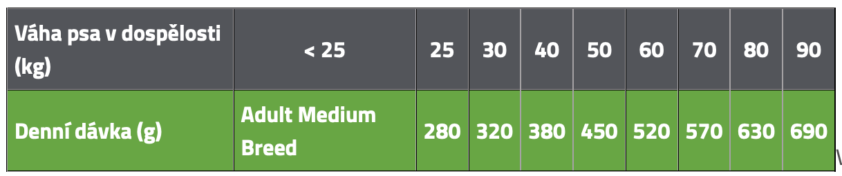 V případě, že hmotnost vašeho psa je menší 25 kg, podávejte Adult Medium Breed.