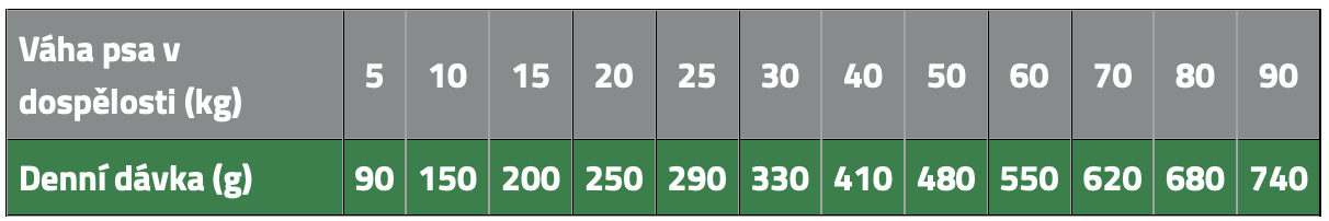 Doporučený denní příjem krmiva uvedený v krmné tabulce rozdělte během dne na 1-2 stejné porce.