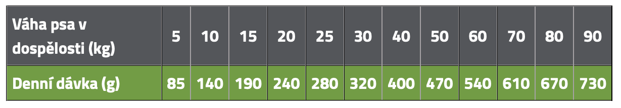 Doporučený denní příjem krmiva uvedený v krmné tabulce rozdělte během dne na 1-2 stejné porce.