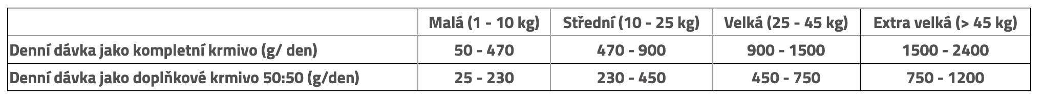 Denní dávka se muže lišit v závislosti na aktivitě a prostředí. V případě podávání pro zvýšení rozmanitosti a chutě k jídlu, nezapomeňte snížit doporučenou denní dávku pravidelného jídla vašeho psa.