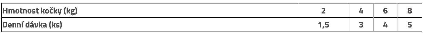 vitamin D3(E671) 250 IU, vitamin E(α-tocopherol) (3a700) 100 mg, zinek (3b606) 10 mg, mangan (E5) 2 mg, jod (3b201) 0,7 mg, měď (E4) 0,2 mg, taurin (3a370) 450 mg, biotin 0,1 mg.