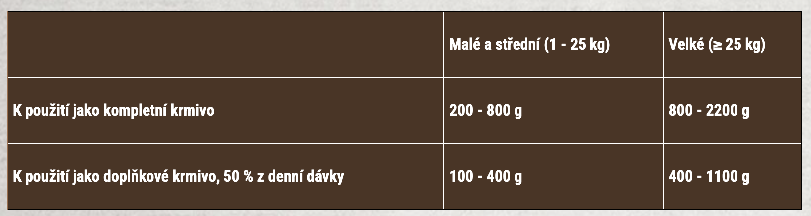 Denní dávka se může lišit v závislosti na věku, velikosti, výkonu a prostředí. Doporučené dávkování naleznete v krmné tabulce. Nezapomeňte na misku s čerstvou vodou, dostupnou po celý den. Skladujte na chladném a suchém místě. Po otevření uchovávejte v lednici a spotřebujte do 2 dnů. Datum exspirace, číslo šarže a registrační číslo jsou uvedeny na spodní straně konzervy.